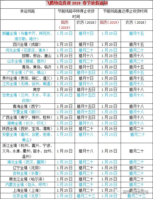 走过18,同行19,飞腾感谢忠诚的客户,正因为有了您的信任与支持,才有飞腾物流的成长,感谢大家积极配合、诚信履约,感谢大家数年如一,不离不弃,春节假期将至,为了更好为您服务,避免影响您春节期间运货需求,现将春节期间各省际线路停运时间特此公告如下: