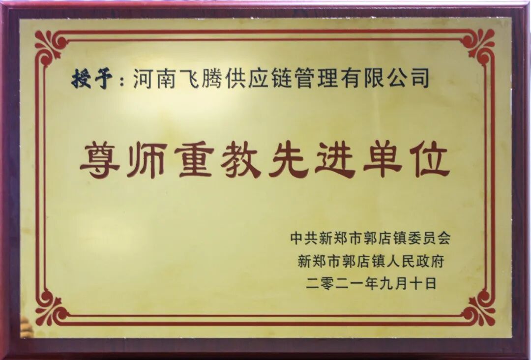 郭店镇党委委员、人大主席侯少利,郭店镇党委委员、纪委书记刘建欣,新郑市教育局副局长郭海峰等领导为17家尊师重教先进单位颁发荣誉奖牌 飞腾物流在此次活动中荣获了由中共新郑市郭店镇委员会和新郑市郭店镇人民政府颁发的尊师重教先进单位奖牌,展现出高度的社会责任感,飞腾物流会继续支持教育事业,重视培养新一代人才。飞腾物流一定会不忘初心,支持教育发展,在探索中实现创新发展,在回馈社会中实现自身价值。